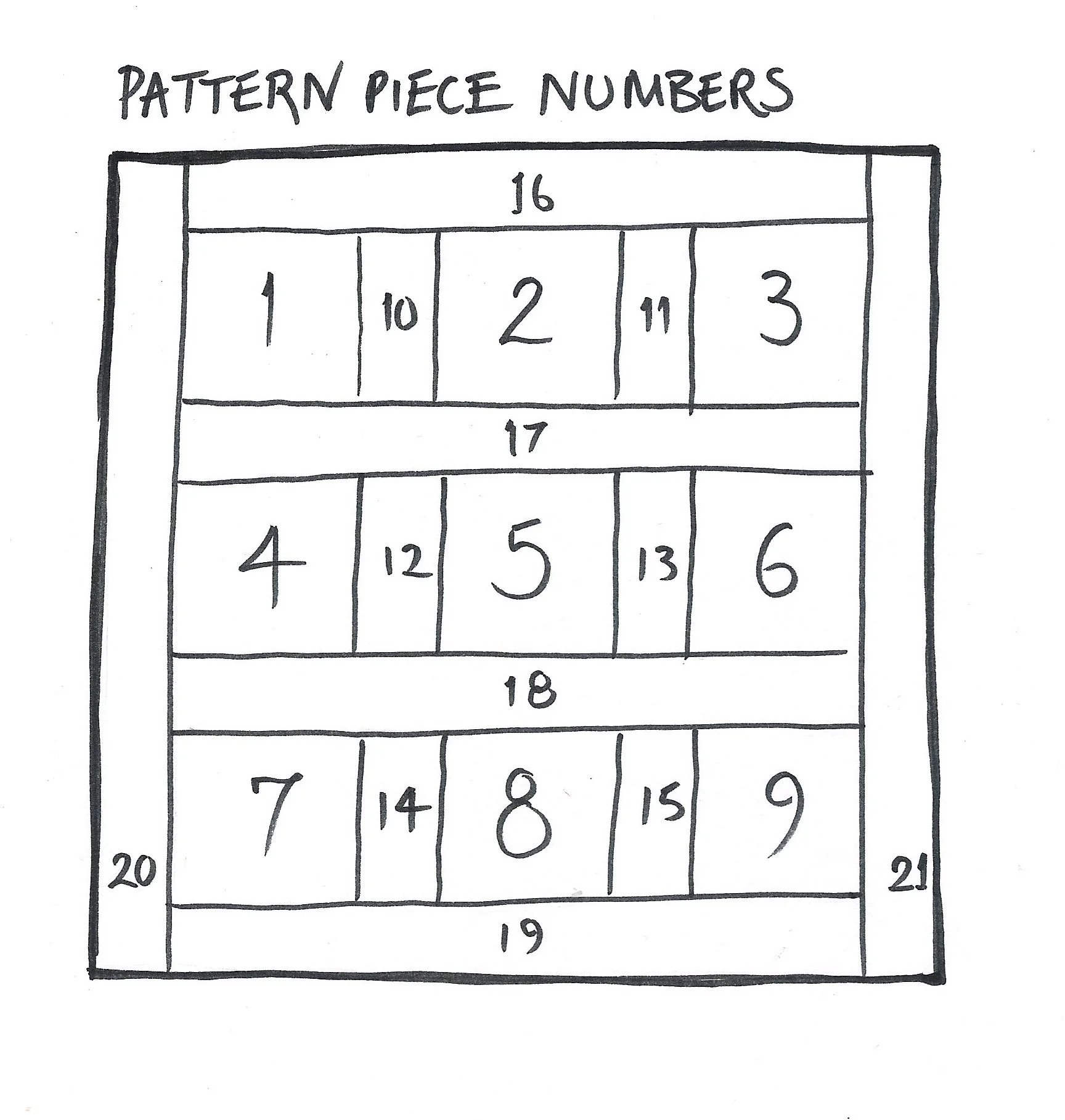Using the cutting guide above, cut all the pieces. Number the rectangular denim pieces on the back of each piece.