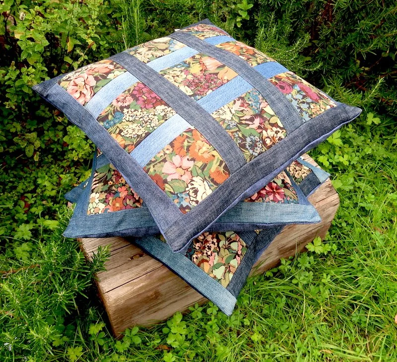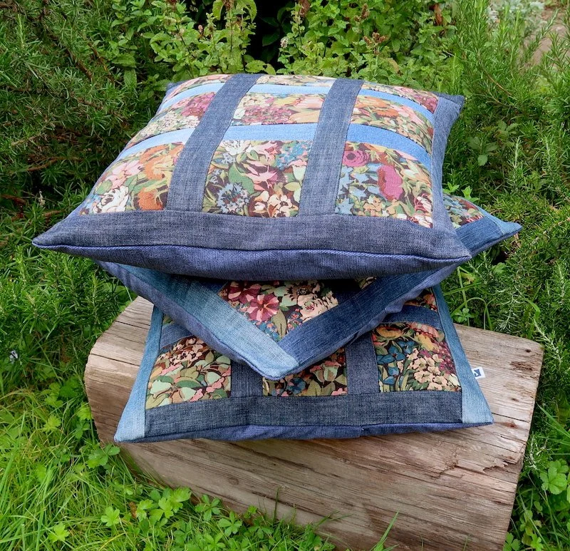 Shop Categories: Select a Category Cushion covers Tote Bags Shop Cushion covers | Tote Bags | Quick View Liberty Cottage Garden and denim patchwork cushion covers - Set of THREE £90.00
